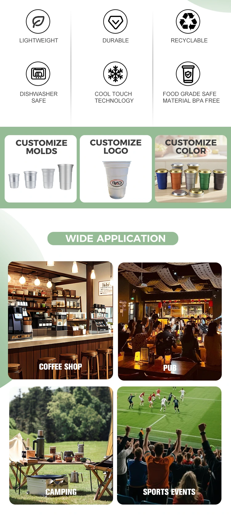 Cásanna gníomhaíochta tráchtála: taispeántais, preasagallamh, sosanna tae gnó agus ócáidí eile. Is féidir an cupán alúmanaim seo a úsáid chun deochanna a shealbhú mar uisce mianraí agus uisce súilíneach. Tá sé éadrom agus éasca a ghlacadh, agus luíonn a tréith in-athchúrsáilte d'íomhá oifige glas na cuideachta. Is féidir é a úsáid chun mion-mhanglaim a ullmhú, uisce beatha a shealbhú, etc. i mbarraí agus barraí soiléire. Is féidir leis an gcomhlacht cupán miotail fionnuar a tharchur go tapa, feabhas a chur ar blas reoite na ndeochanna, agus ag an am céanna stíl faiseanta a chur leis an atmaisféar club oíche.