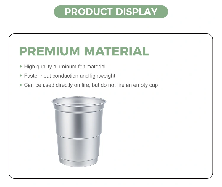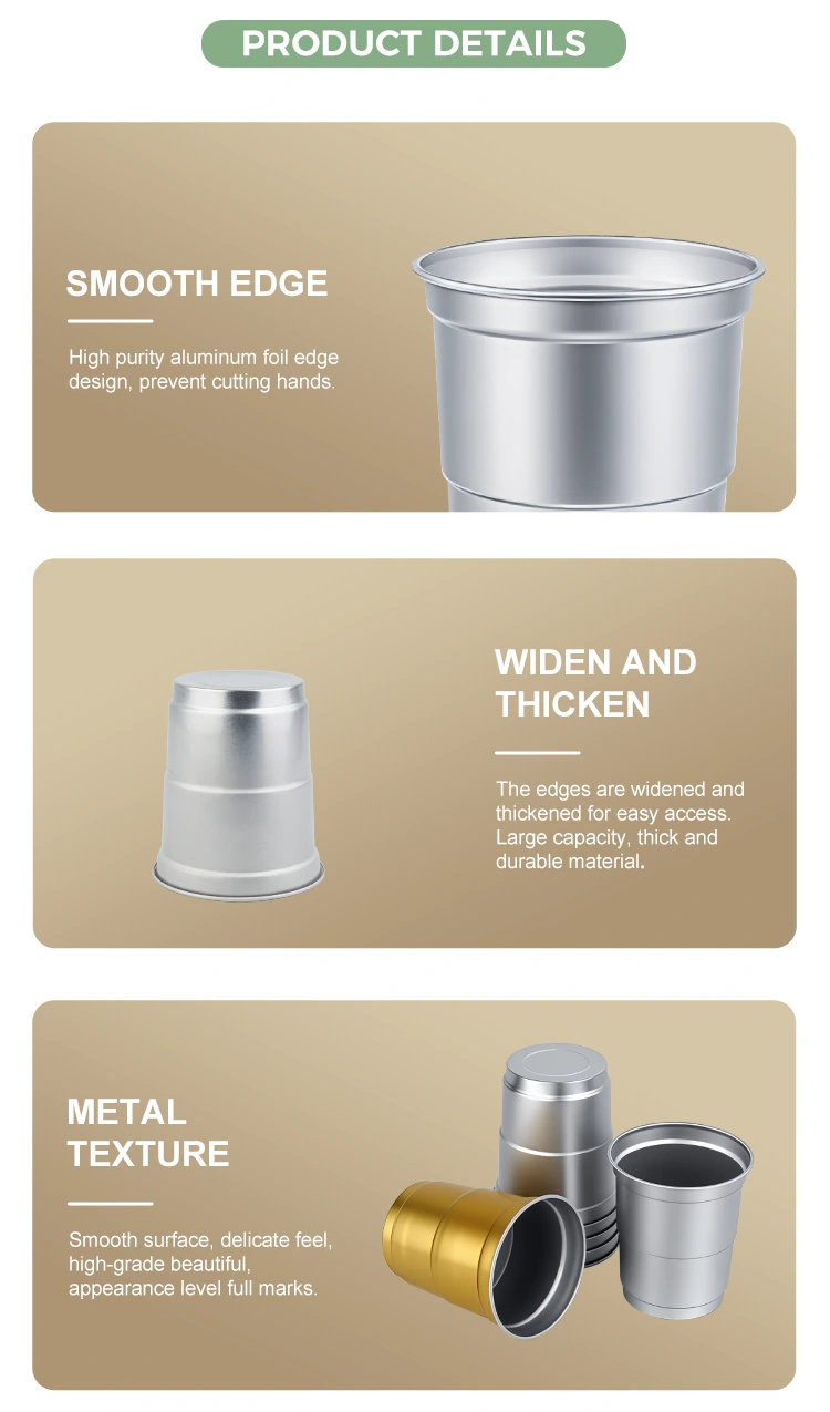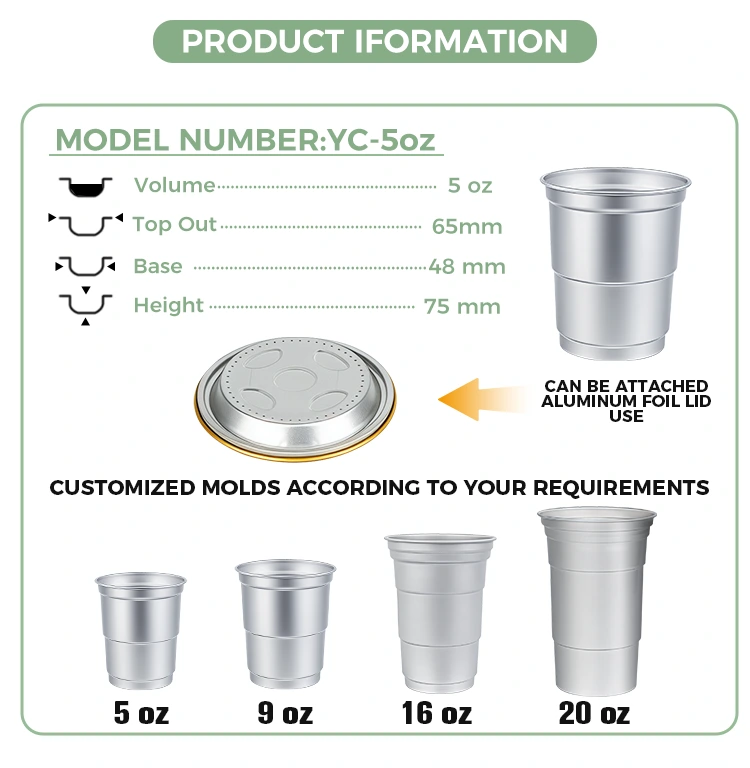 Déanann cupán dí alúmanaim deoch fuar indiúscartha 5oz indiúscartha scragall alúmanaim Yunchu, le uigeacht miotail alúmanam simplí agus galánta, an cupán dí seo oiriúnach do raon leathan cásanna, a chlúdaíonn ilréimsí mar oibríochtaí tráchtála, cruinnithe fóillíochta, imeachtaí ar scála mór, etc., ag éirí mar an réiteach is fearr le haghaidh pacáistiú cás-bhunaithe: