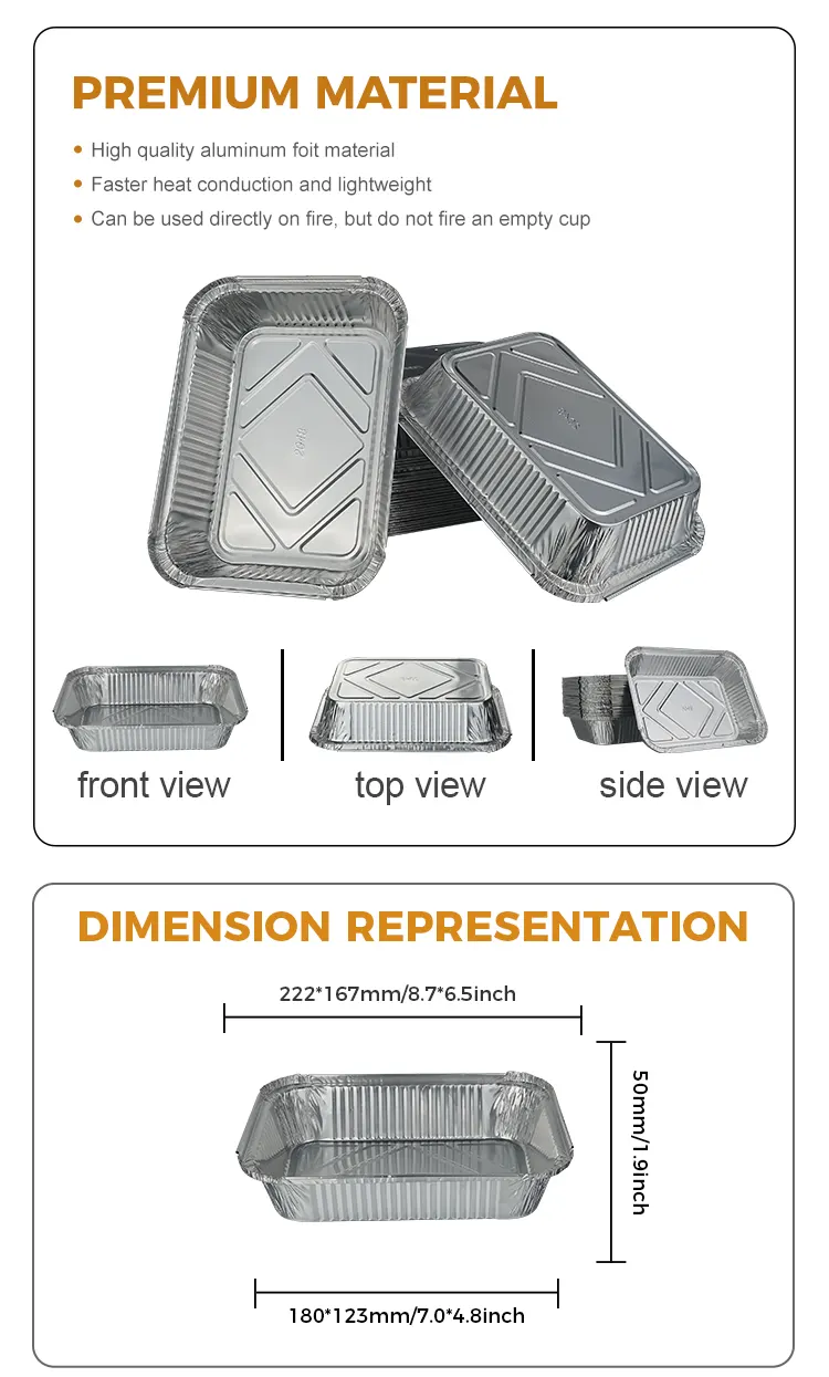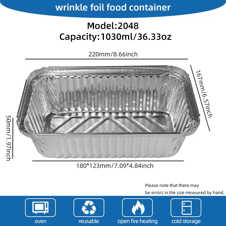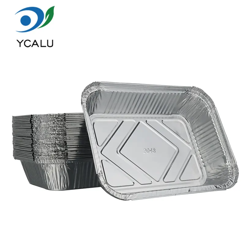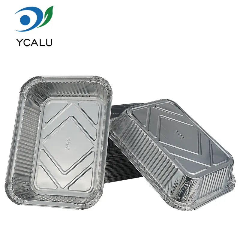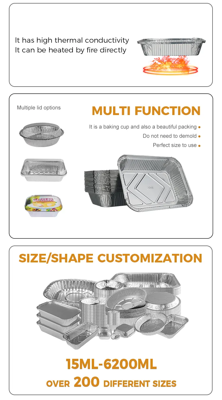 Tá bosca lóin bácála barbeque indiúscartha Yunchu Alúmanam Foil Factory coimeádán scragall alúmanaim airgid déanta as scragall alúmanaim grád bia ard-íonachta. Tá sé neamh-tocsaineach agus gan blas, resistant a teocht ard agus teocht íseal. Tá an leáphointe chomh hard le 250°C. Is féidir é a bheith i dteagmháil dhíreach le bia. Ní scaoileann sé substaintí díobhálacha nuair a théitear ag teocht ard. Is féidir leis cruth cobhsaí a choimeád freisin nuair a bhíonn sé cuisnithe agus reoite. Is dearadh aonuaire é agus is féidir é a chaitheamh amach tar éis é a úsáid. Ní gá am a chaitheamh ag glanadh plátaí agus pannaí bácála, díthocsainiú go hiomlán Réitíonn sé an fhadhb tedious a bhaineann le glanadh tar éis béilí, agus tá sé oiriúnach go háirithe do radhairc cosúil le cruinnithe le go leor daoine agus taisteal lasmuigh. Tá uigeacht láidir agus cumas tacaíochta láidir ag an ábhar scragall alúmanaim ramhraithe uasghrádaithe. Níl sé éasca le sceitheadh ​​​​nó dífhoirmiú nuair a bhíonn miasa á gcoimeád le anraithí nó le comhábhair barbeque trom. Tá na himill réidh agus saor ó burr, rud a fhágann go bhfuil sé níos sábháilte é a úsáid. Tá sé oiriúnach freisin le haghaidh oighinn, friochtáin aeir, galtáin agus uirlisí cistine eile, agus is féidir cócaireacht agus riar a dhéanamh in aon chéim amháin.