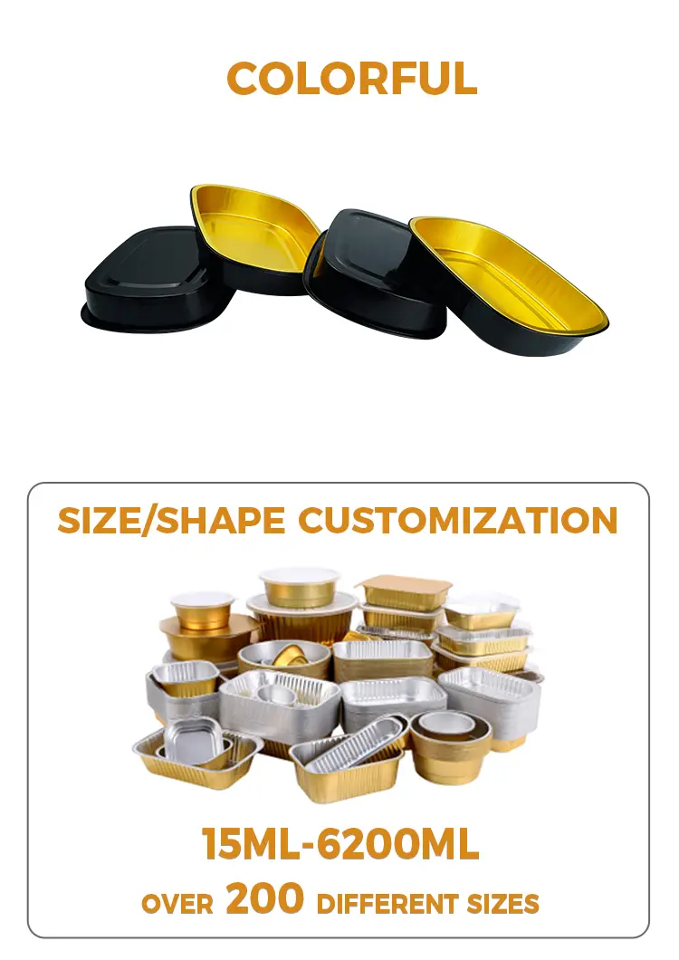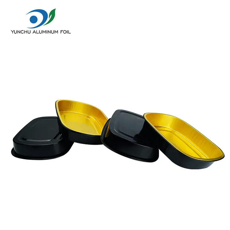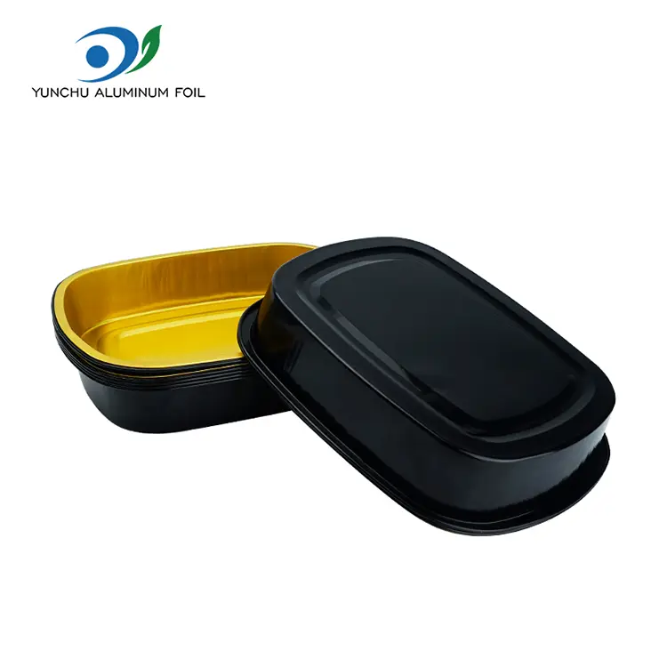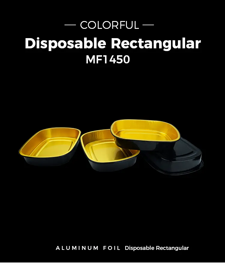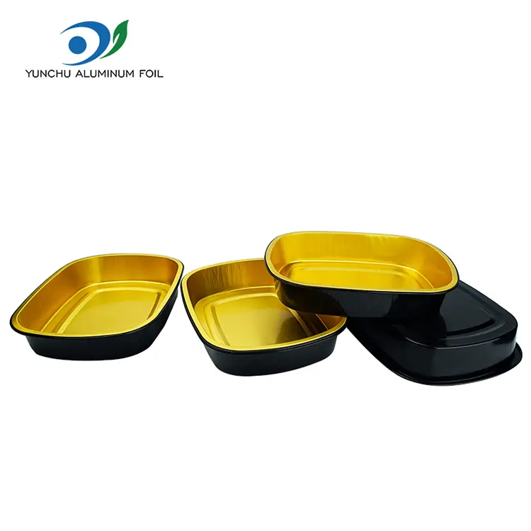 Yunchu aluminum foil supplier Disposable black gold baking tray Rectangular Aluminum Foil Containers MF1450 is suitable for large-scale catering, especially suitable for canteen catering, restaurant chain stores and refrigerated food distribution and other scenarios, this product is made of high-strength aluminum foil material, low height is suitable for some turkey, grilled fish, stewed and other ingredients of food to place, strong thermal Is féidir le seoltacht an teocht ard a scaipeadh go cothrom, chun a chinntiú go ndéantar an bia a théamh go cothrom, le hacmhainn mhaith ualach agus feidhmíocht chomhbhrúite, chun a chinntiú nach bhfuil sé éasca é a dhíbirt agus a dhífhoirmiú le linn iompair, is féidir é a úsáid le séala teasa scragall nó le clúdach plaisteach.