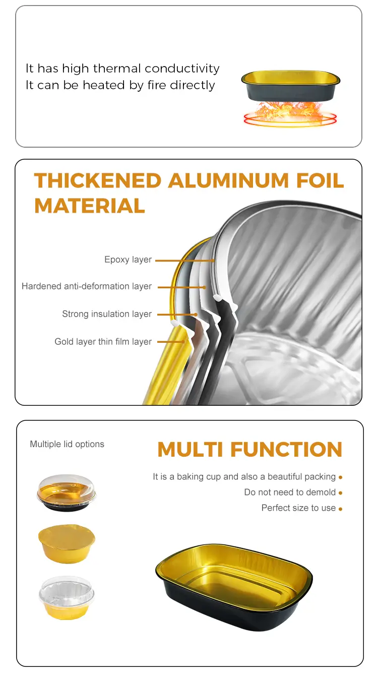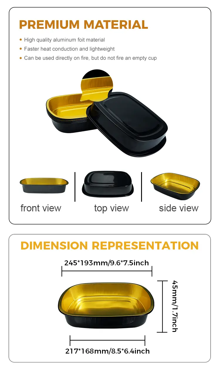 ​Yunchu aluminum foil supplier Disposable black gold baking tray Rectangular Aluminum Foil Containers MF1450 is suitable for large-scale catering, especially suitable for canteen catering, restaurant chain stores and refrigerated food distribution and other scenarios, this product is made of high-strength aluminum foil material, low height is suitable for some turkey, grilled fish, stewed and other ingredients of food to place, strong thermal Is féidir le seoltacht an teocht ard a scaipeadh go cothrom, chun a chinntiú go ndéantar an bia a théamh go cothrom, le hacmhainn mhaith ualach agus feidhmíocht chomhbhrúite, chun a chinntiú nach bhfuil sé éasca é a dhíbirt agus a dhífhoirmiú le linn iompair, is féidir é a úsáid le séala teasa scragall nó le clúdach plaisteach.