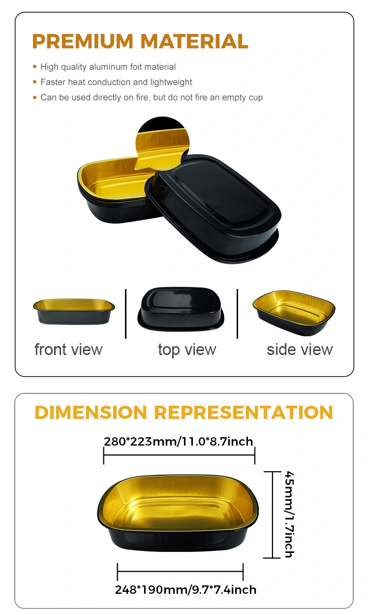Tá coimeádáin scragall alúmanaim dhronuilleogach alúmanaim alúmanaim Yunchu alúmanaim oiriúnach do dhaoine iolracha nó do chásanna itheacháin féinseirbhíse, go háirithe atá oiriúnach do phacáistiú miasa mar ghratin nó pasta bácáilte. Tá an táirge seo oiriúnach freisin le haghaidh pacáistiú boscaí lóin, lónadóireacht agus beir leat, chomh maith le pacáistiú roghnach miasa ullmhaithe. Tá an coimeádán déanta as scragall alúmanaim bhia-ghrád ardcháilíochta, atá sábháilte agus saor ó bholadh, agus a chomhlíonann caighdeáin teagmhála bia idirnáisiúnta. Nuair a chuirtear in éineacht le scannán ina saothraítear teasa, is féidir leis séalaithe éifeachtach a bhaint amach agus cosc ​​a chur ar sceitheadh ​​anraith go héifeachtach, rud a chiallaíonn go bhfuil sé oiriúnach do threalamh uathoibrithe ina saothraítear rónta. Tá dromchla réidh agus réidh ag an gcoimeádán le haghaidh lipéadú éasca agus cuma álainn a chuidíonn le híomhá an bhranda a fheabhsú. Tá sé frithsheasmhach in aghaidh teochtaí arda agus íseal, is féidir é a úsáid sa raon teochta -20 ° C go 250 ° C, agus tacaíonn sé le modhanna teasa éagsúla amhail cuisniú, bácáil agus gaile. Tá an t -ábhar scragall alúmanaim 100% in -athchúrsáilte agus comhlíonann sé riachtanais na forbartha inbhuanaithe.