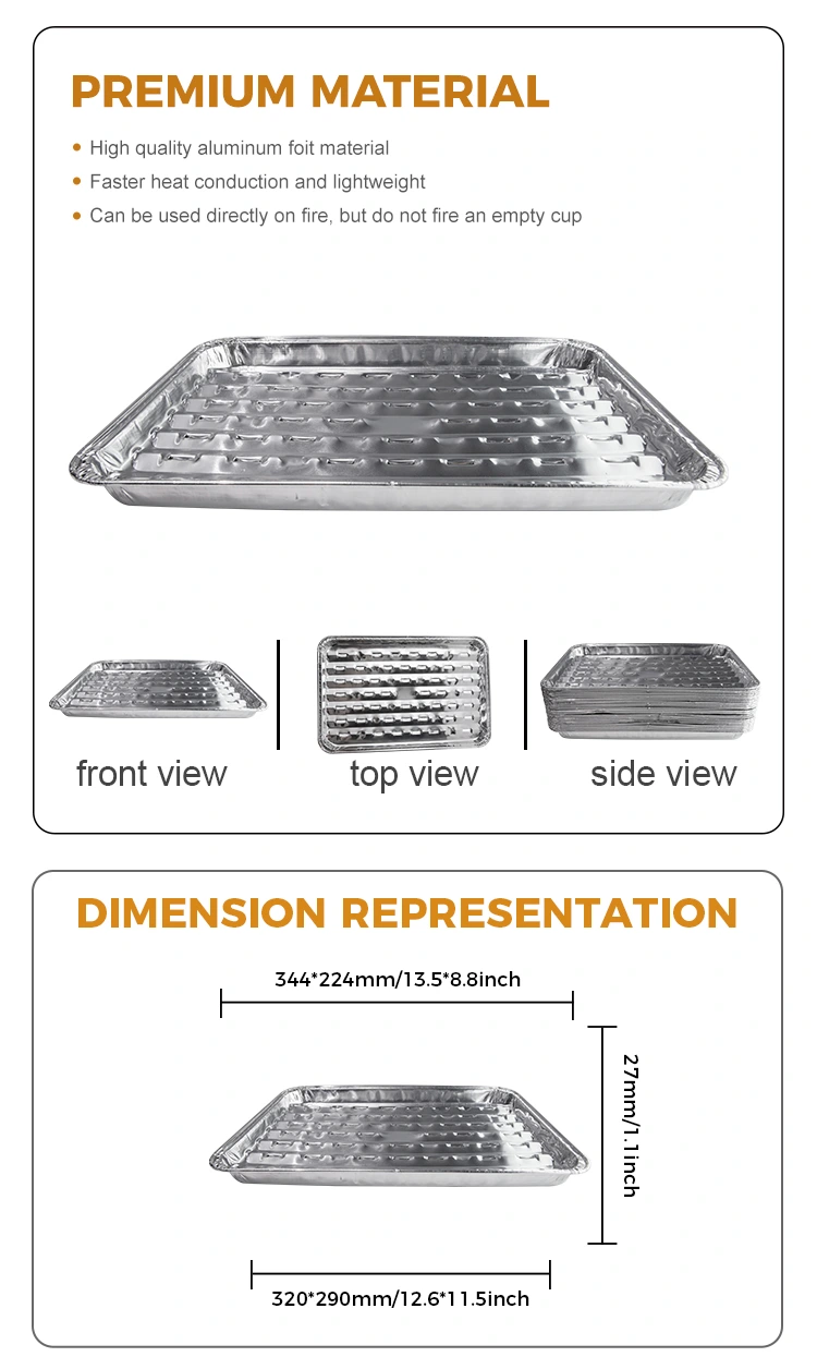 Tá an soláthróir grill indiúscartha de chuid an tsoláthraí grill alúmanaim Yunchu oiriúnach le haghaidh grilling amuigh faoin aer agus faoi dhíon, tá dearadh poll uathúil ag an tráidire bácála seo, níl aon ghá le bheith buartha faoi fhadhb deataigh ola. Ceadaíonn dearadh na bpoll seoladh tapa teasa agus téamh níos aonfhoirmeacha, ag seachaint róthéamh áitiúil tráidirí bácála traidisiúnta. Cibé an bhfuil sé ag campáil sa bhfásach nó sa bhailiúchán teaghlaigh, soláthraíonn an griddle seo timpeallacht ghlan, shláintiúil do do barbeque. Déantar panna grill indiúscartha scragall alúmanaim Yunchu as ábhair teagmhála grád bia chun sláinteachas agus sábháilteacht a chinntiú le linn an phróisis barbeque. Ní hamháin go bhfuil an t-ábhar scragall alúmanaim ardcháilíochta durable, ach tá dromchla réidh aige agus gan aon bholadh, rud a ligeann duit do bhéile a thapú gan a bheith buartha faoi aon rioscaí sláinte. Dearadh an uile bhácála seo le gach mion san áireamh, ó chuma go praiticiúlacht.