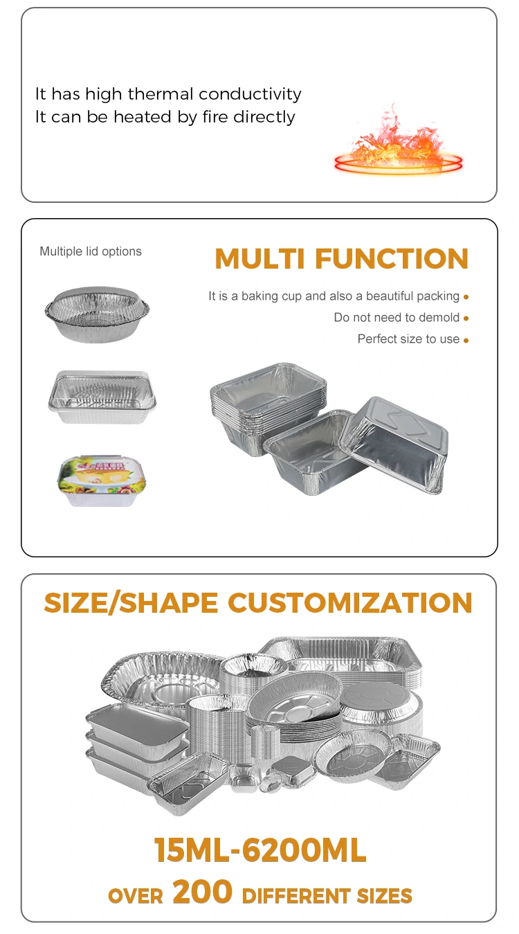 Tá coimeádán scragall alúmanaim airgid bácála dronuilleogach indiúscartha monaróir scragall alúmanaim Yunchu deartha le haghaidh riachtanais cistine, bácála agus lónadóireachta áisiúil. Úsáideann sé scragall alúmanaim de ghrád bia mar amhábhar agus déantar é a stampáil go beacht chun sábháilteacht, praiticiúlacht agus cosaint an chomhshaoil ​​a chur san áireamh. Réitíonn sé go hiomlán na pointí pian a bhaineann le glanadh tedious tar éis bácála, inoiriúnaitheacht lag coimeádán, agus boladh na gcomhábhar, rud a fhágann go bhfuil gach béile éasca, saor ó imní, glan agus éifeachtach. Tá seoltacht theirmeach áirithe ag an gcoimeádán scragall alúmanaim bácála dronuilleogach indiúscartha, stiúrann sé teas go cothrom agus go tapa, agus is féidir leis a oiriúnú go cruinn do thimpeallacht ardteochta an fhriotóra aeir. Is féidir leis teochtaí foircneacha a sheasamh ó -20°C go 250°C. Is féidir é a chur go díreach sa chuisneoir aer le haghaidh téimh tar éis é a thógáil amach as an gcuisneoir gan an coimeádán a athrú. Tá an t-ábhar scragall alúmanaim tiubhaithe an-diana agus ní éasca é a dhífhoirmiú nó a bhriseadh. Seachnaíonn sé salachar ar phota istigh an chuisneora aeir agus an oigheann, rud a chuireann deireadh leis an ngá atá le céimeanna glantacháin tedious. Mar tháirge úsáide aon-uaire, is féidir é a chaitheamh tar éis é a úsáid gan glanadh, do lámha a shaoradh go hiomlán. Ag an am céanna, is féidir an t-ábhar scragall alúmanaim a athchúrsáil 100%.