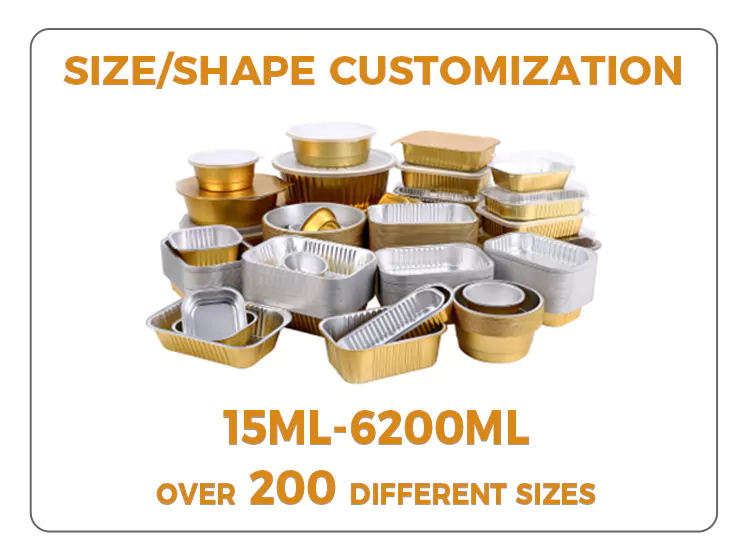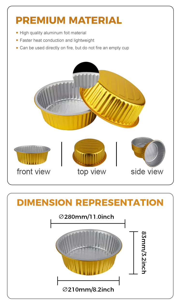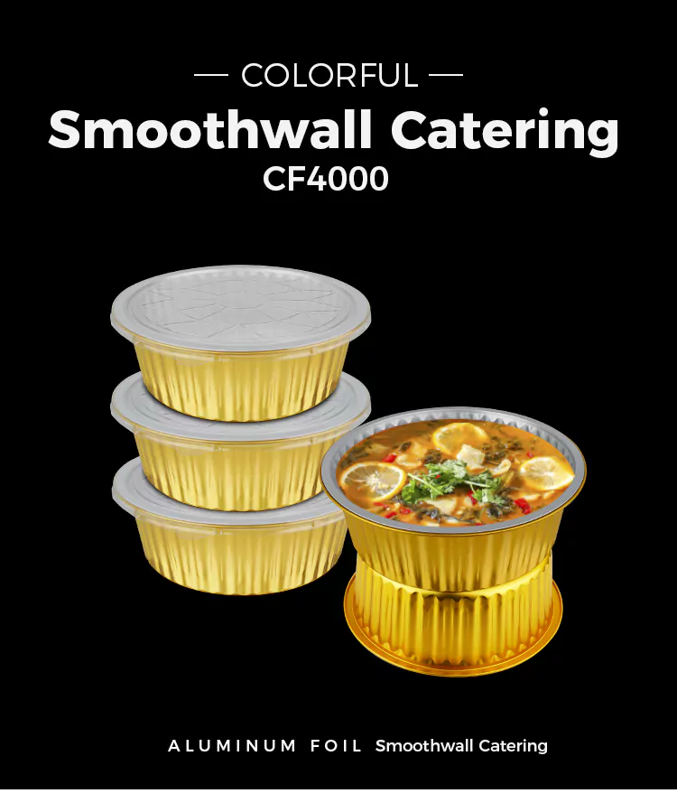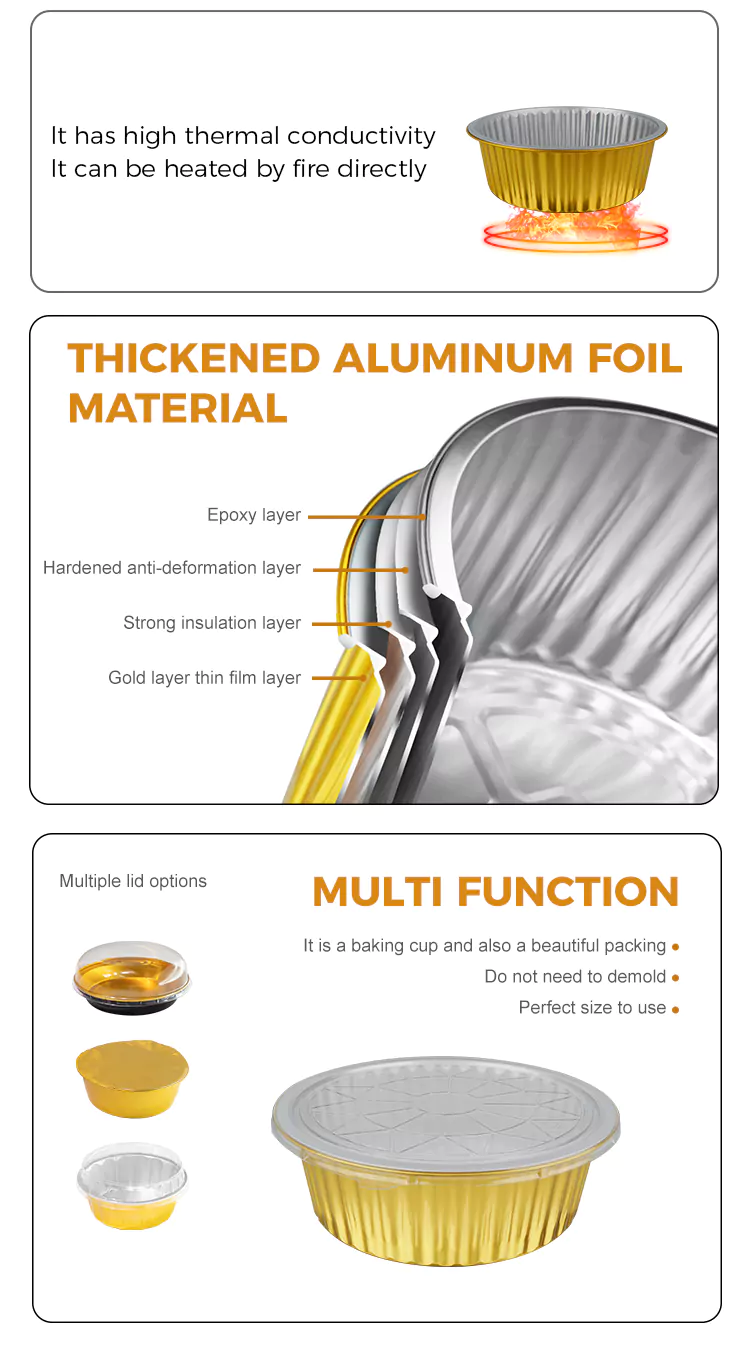 Dírímid ar dhearadh neart Gabhdáin Scragall Alúmanam óir bhabhta Indiúscartha. Tá tiús an bhalla comhréireach go heolaíoch chun solúbthacht a áirithiú maidir le múnlú éasca agus cumas ualachiompartha leordhóthanach. Níl sé seans maith le dífhoirmiú nó le sceitheadh ​​​​nuair a úsáidtear é chun anraithí, miasa, earraí bácáilte, srl., Déileáiltear leis na himill le próiseas imeall rollta, ag soláthar teagmháil réidh nach scratch an lámh, rud a fhágann go bhfuil sé níos sábháilte a úsáid. Cuirimid éagsúlacht sonraíochtaí acmhainne ar fáil do do rogha, ó mhionbhoscaí milseog go pacáistí comhroinnte teaghlaigh, ag freastal ar riachtanais cásanna éagsúla. Cibé an bhfuil sé le tógáil amach i mbialanna, le pacáistiú táirgí críochnaithe i mbáicéireachta, nó le haghaidh milseoga baile a stóráil sa bhaile, is féidir iad go léir a oiriúnú go héasca.