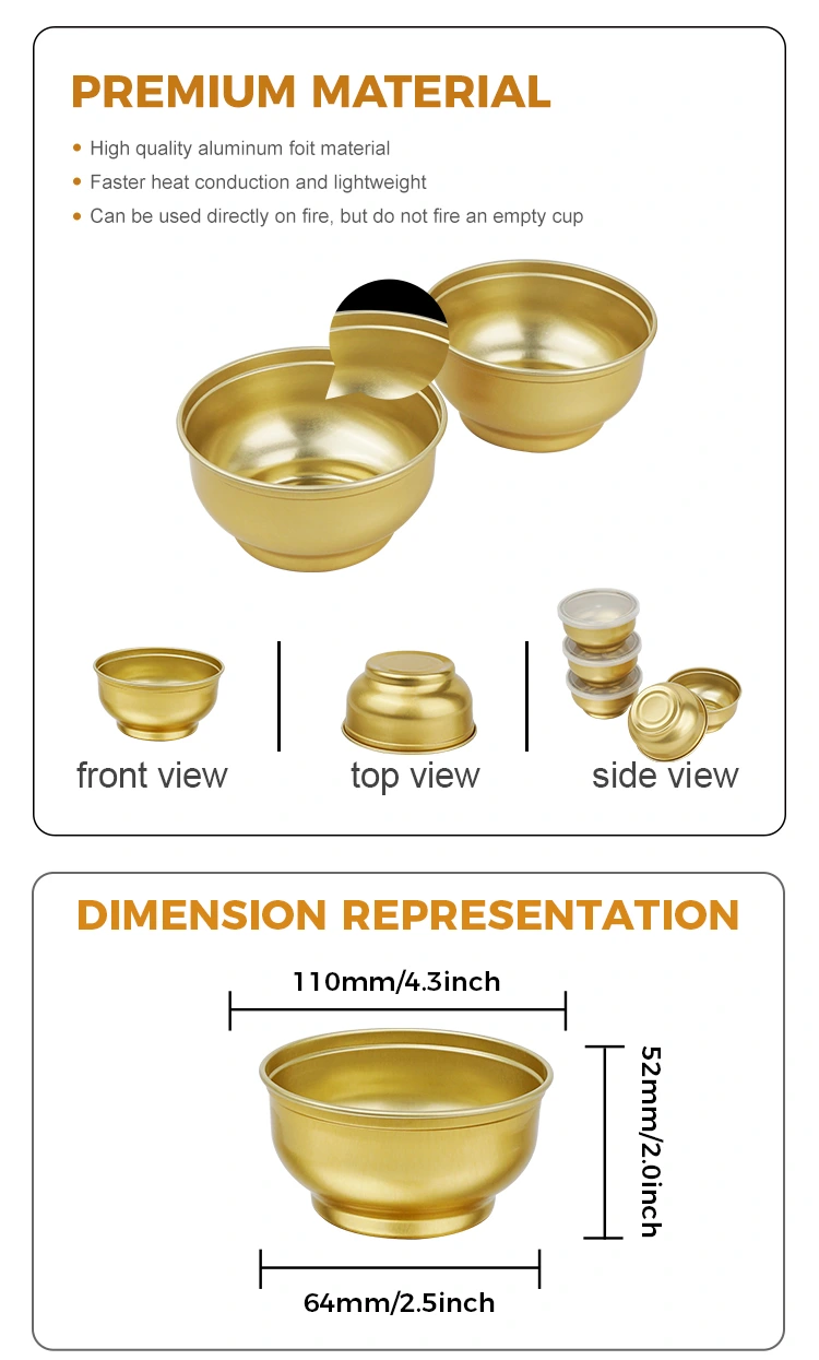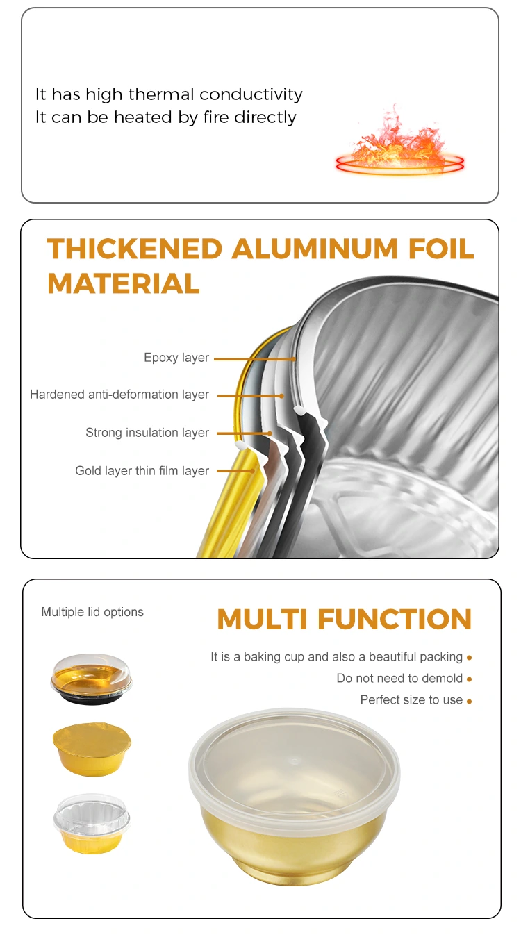 Monarcha déantúsaíochta scragall alúmanaim Yunchu, coimeádáin scragall alúmanaim bhabhla babhla ór beag, coimeádán scragall alúmanaim alúmanaim atá múnlaithe go sainiúil, tá an coimeádán seo dírithe ar phacáistiú, béilí réamh-chócaráilte, ríse, núdail, srl. Ní bhíonn damáiste craicinn ag baint le babhlaí atá pacáistithe ina n -aonar, éasca le hiompar, déanta as ábhair bhréige agus mharthanacha roghnaithe, fillte ina n -aonar, i bhfolús steiriliú, éasca le hoscailt agus a ithe, atá in ann úire a ghlasáil le linn cócaireachta ag 121 ° C. Ní féidir an babhla bunaidh a théamh sa MICREATHONNACH. Ar fáil i sonraíochtaí éagsúla, atá in ann a stóráil, is féidir na babhlaí alúmanaim a chruachadh chun an chistin a choinneáil slachtmhar agus eagraithe. Freastalaíonn méideanna éagsúla ar riachtanais phacáistithe éagsúla - tá babhla amháin ag an am ceart.