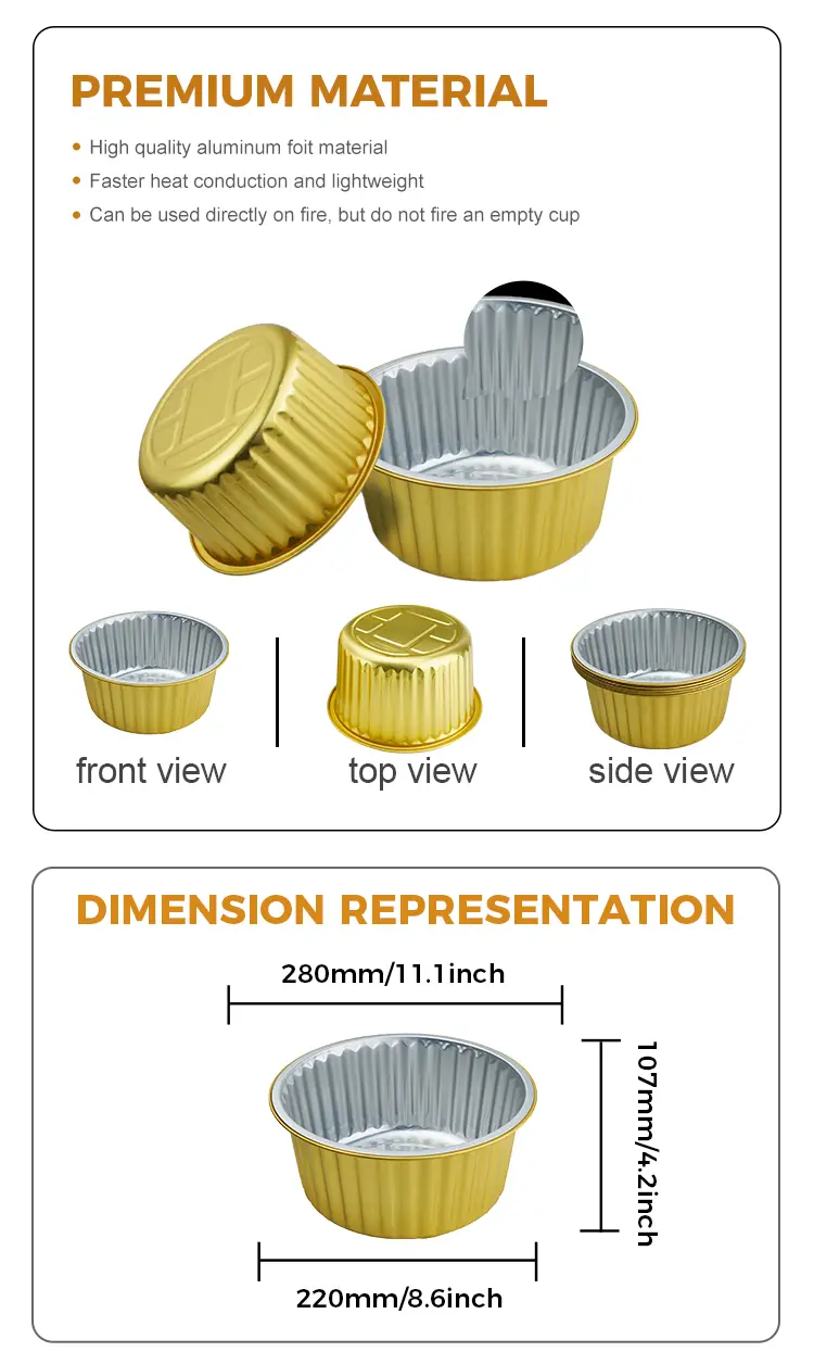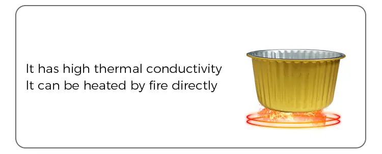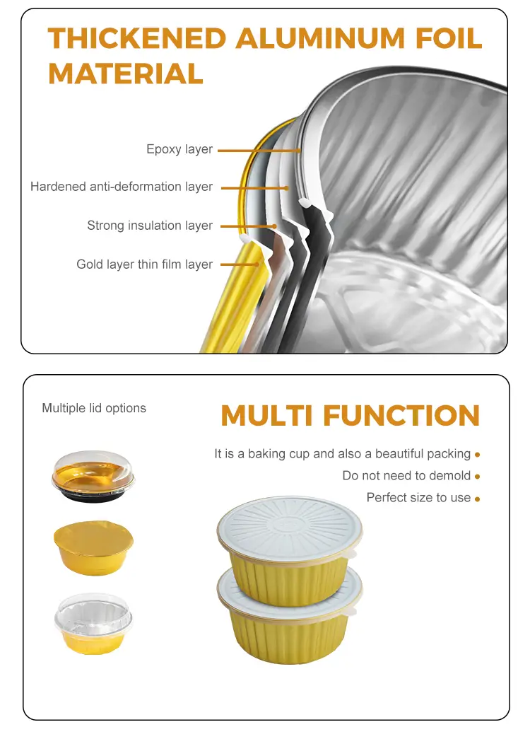 Tá raon leathan úsáidí ag baint le coimeádáin scragall alúmanaim alúmanaim in-indiúscartha alúmanaim in-indiúscartha soláthair. Tá siopaí ollmhargaidh, páirtithe saoire, gníomhaíochtaí lónadóireachta, siopaí lónadóireachta féinseirbhíse, srl. Ceadaíonn an t-ábhar dáileadh aonfhoirmeach teasa, coinneáil teasa maith, gan aon ghreamaitheacht, gan dó, uiscedhíonach agus cruthúnas ola, gan aon ghá le glanadh, gan aon ualach ar stains ola. Ní ghortaíonn na himill réidh do lámha, ag cinntiú go bhfuil na miasa réamhullmhaithe cócaráilte go hiomlán; Tá an panna scragall críochnaithe i ndath óir galánta a fheabhsaíonn an cur i láthair agus a chomhlánaíonn do chistin nó do dhécor imeachtaí.