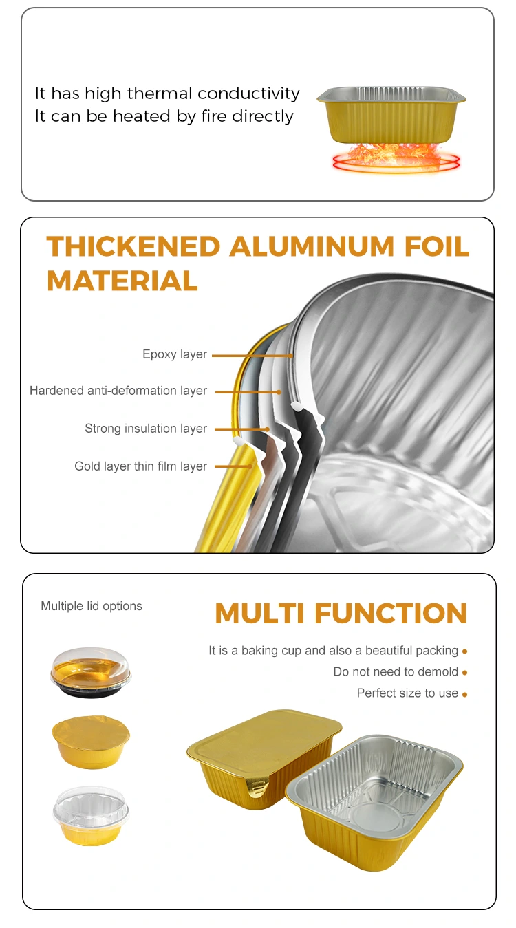 Yunchu aluminum foil Disposable square seal gratin Aluminum Foil Containers, suitable for single serving of baked rice or baked pasta and other dishes packaging, packaging lunch box catering and take-out, pre-made dishes can choose packaging products, this Disposable square seal gratin Aluminum Foil Containers is made of high-quality food-grade aluminum foil, safe and odorless, in line with international food Caighdeáin Teagmhála. Leis an scannán ina saothraítear teasa, is féidir leis séalaithe éifeachtach a bhaint amach agus cosc ​​a chur go héifeachtach ar sceitheadh ​​anraith, atá oiriúnach do threalamh uathoibríoch ina saothraítear rónta. Tá dromchla an choimeádáin réidh agus cothrom, atá éasca le lipéadú, agus tá sé go hálainn agus go flaithiúil, rud a chabhraíonn leis an íomhá bhranda a fheabhsú. Tá sé frithsheasmhach in aghaidh teochtaí arda agus íseal, is féidir é a úsáid i raon teochta -20 ° C go 250 ° C, agus tacaíonn sé le modhanna teasa éagsúla amhail cuisniú, bácáil, agus gaile. Tá an t -ábhar scragall alúmanaim 100% in -athchúrsáilte agus inbhuanaithe.