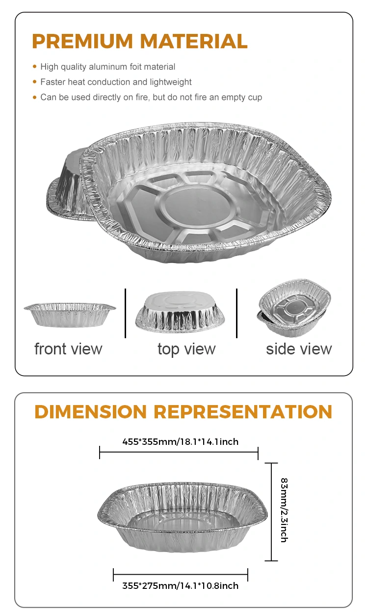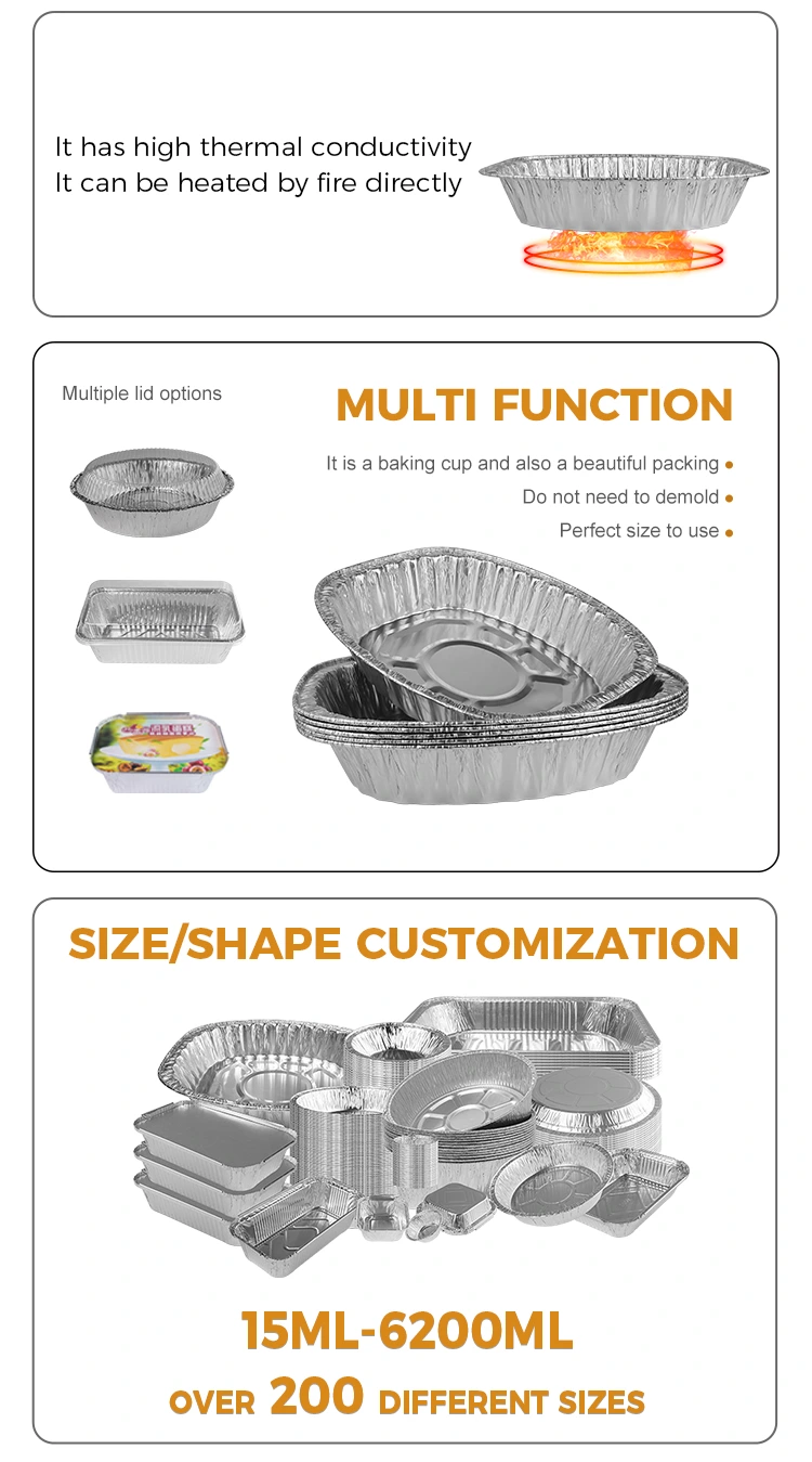 Is táirge indiúscartha é an táirge seo agus ní gá é a ghlanadh, rud a chosnaíonn costais saothair. Is féidir é a phéireáil le lid scragall alúmanaim atá trédhearcach go hiomlán trédhearcach, a chuireann cosc ​​go héifeachtach ar dheannach agus ar sceitheadh ​​leachtach. Cuirtear le marthanacht agus le sábháilteacht an táirge trí dhearadh na stiffeners agus cruth rialta cuasach agus dronnach an bhun. Fágann an dearadh iniompartha go bhfuil sé éasca é a iompar agus a théamh, atá frithsheasmhach in aghaidh teochtaí arda agus íseal, atá in ann é a úsáid i raon teochta -20 ° C go 250 ° C, agus go bhfuil sé neamh -thréscaoilteach d'ola agus d'uisce, ag feabhsú coinneáil teasa agus déine iompair an táirge.