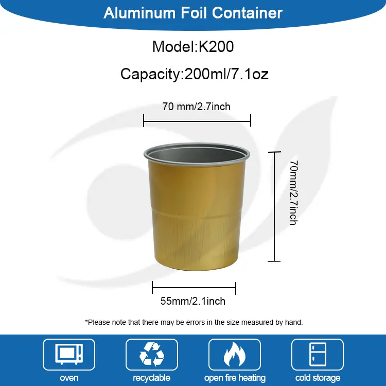 Yunchu Aluminum Foil Factory K120One-time camping Coffee Drinking Cup is made of high-quality food-grade materials, made of 8011 aluminum foil, non-toxic and tasteless, safe to use, the surface of the coffee cup adopts a modern design style, the bottom of the groove stands firmly, with a good anti-slip effect, you don't need to clean the coffee cup, you can choose to throw and recycle when you run out, fast heat Tá seoladh, te agus fuar, deochanna trick, deochanna te an -mhaith agus diomailt teasa aonfhoirmeach, níl an lámh te agus compordach, ciseal ar chiseal stórála, ag sábháil níos mó spáis, dearadh coirp cónúil, dearadh an leathana ar an mbarr agus tá an bun caol saincheaptha, rud a thugann rogha do thomhaltóirí níos fearr.