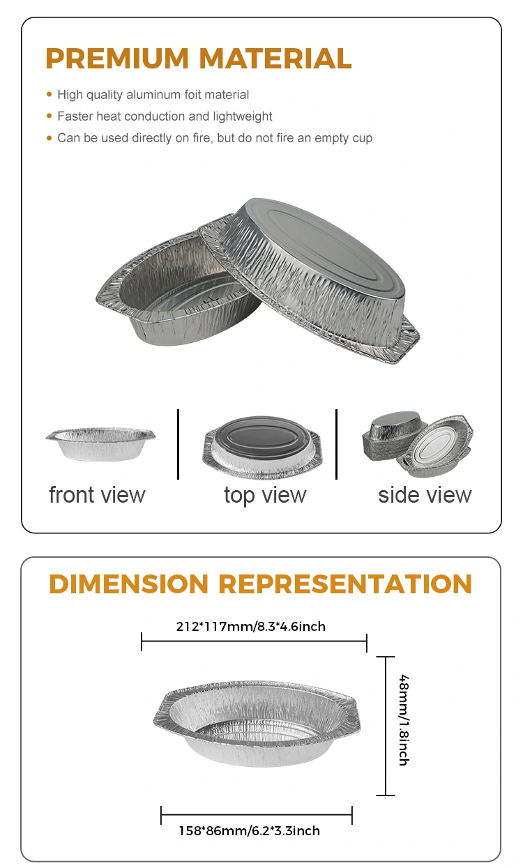 Is féidir coimeádáin scragall alúmanaim alúmanaim alúmanaim ubhchruthach a úsáid go díreach san oigheann nó sa ghreille, rud atá an -áisiúil. Gan ach 5.9 gram a mheá, tá sé éasca stac a dhéanamh go néata, go héifeachtach ag sábháil spáis le haghaidh iompair, plating bialainne agus cistine. Mar gheall ar phróiseas éadrom balla an táirge, tá an dromchla réidh agus slachtmhar, agus ní hamháin go bhfuil an chuma gheal airgid álainn agus galánta, ach freisin go bhfuil sé áisiúil do ollmhargaí móra cóid a lipéadú agus a scanadh.