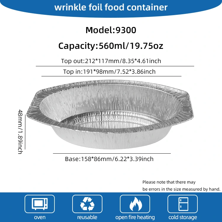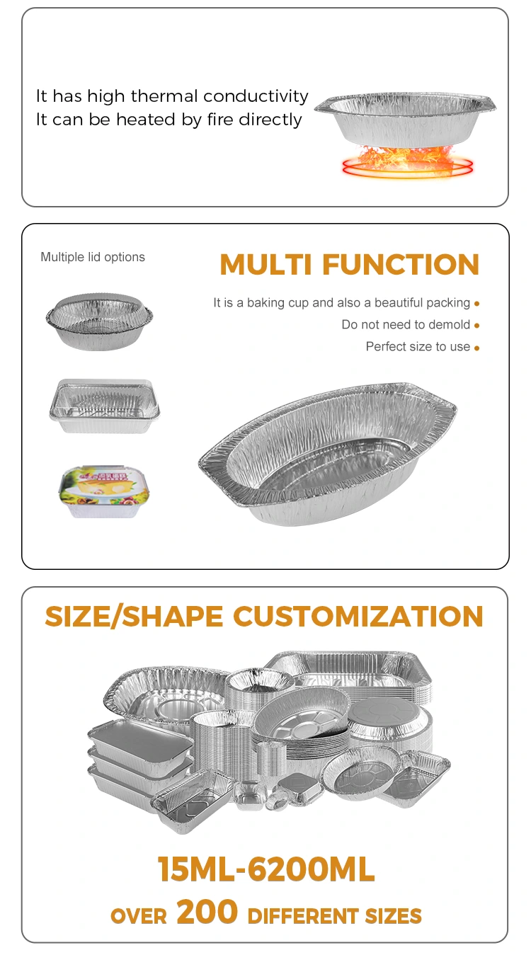 Tairgeann soláthróir scragall alúmanaim Yunchu coimeádáin scragall alúmanaim airgid arán bácáilte ubhchruthach le haghaidh cócaireachta baile, báicéirí, siopaí slabhra, agus seachadadh bia cuisnithe. Tá cruth uathúil ubhchruthach sa choimeádán seo, atá crafáilte ó ábhar scragall alúmanaim bhia-ghrád bia a fhágann go bhfuil sé i measc na mboscaí bácála airgid go leor. Tá an coimeádán seo oiriúnach go háirithe chun ciarsúir te, torthaí, arán agus gach cineál bianna a choinneáil, agus is féidir leis freastal ar riachtanais raon leathan earraí boird. Mar gheall ar a sheoltacht teirmeach mhaith, is féidir leis teochtaí arda a dhíscaoileadh go cothrom, ag cinntiú go ndéantar bia a théamh go cothrom. Ina theannta sin, tá cumas áirithe ualach agus friotaíocht brú aige, ag cothabháil cobhsaíochta fiú i gcás il-stacanna, ag cur cosc ​​ar dhífhoirmiú, agus tá sé oiriúnach le húsáid le linn iompair. D'fhonn dul in oiriúint níos fearr do chásanna agus do riachtanais éagsúla, is féidir an coimeádán seo a oiriúnú de réir riachtanais na gcustaiméirí agus lids meaitseála a sholáthar do phraiticiúlacht bhreise.