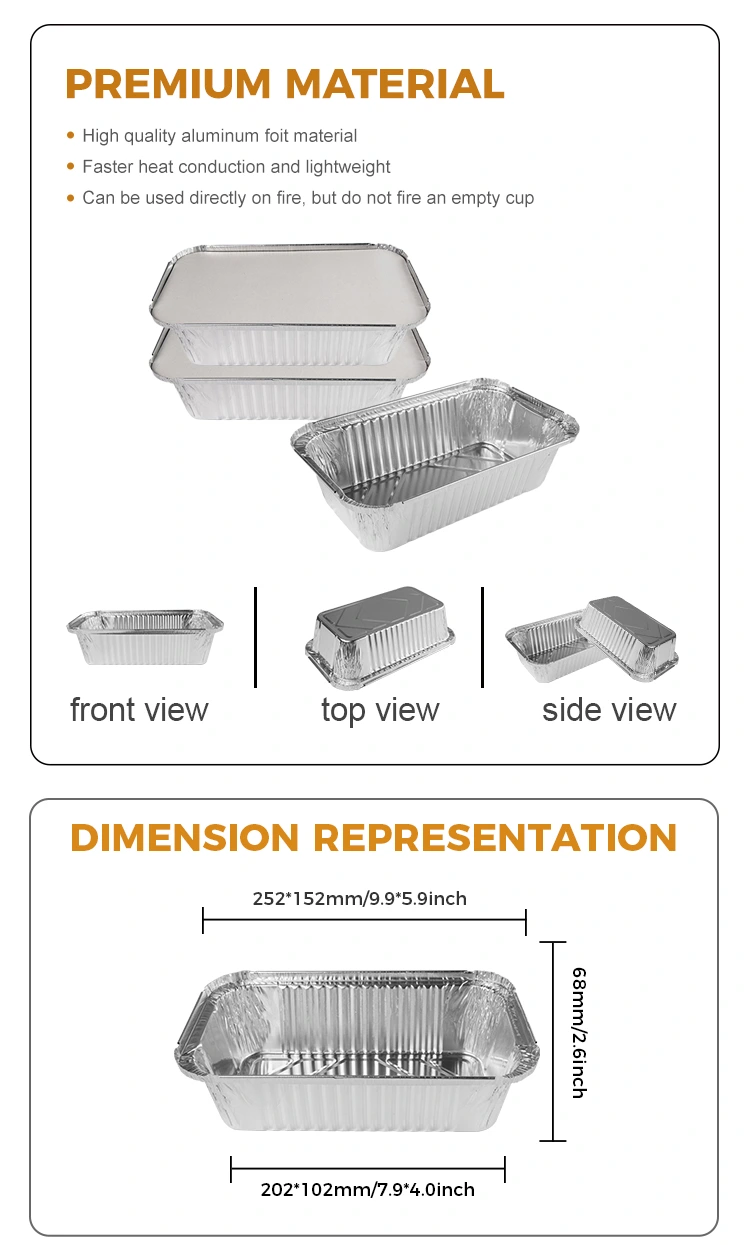 Yunchu aluminum foil supplier Rectangular air fryer packing Silver Aluminum Foil Containers, longer thermal insulation, long barbecue aluminum foil container, hygienic and healthy material, can directly contact food, selected high-quality aluminum foil material, reliable product quality, heat preservation, retain the original taste of food, lock the heat of food, enjoy healthy food, large portion loading, no need to clean laboriously, can accommodate Is féidir an chuid is mó de bhia a úsáid le clúdach scragall alúmanaim, scragall alúmanaim taobh amháin, cárta bán taobh amháin. Is é an dromchla scragall alúmanaim ná cruthúnas ola agus uiscedhíonach, agus tá an taobh scragall alúmanaim ag tabhairt aghaidh air nuair a úsáidtear é. Tacaíocht a thabhairt do chomhcheangal scragall alúmanaim is féidir le hordú mórdhíola a sholáthar, saincheapadh priontála patrún a sholáthar, MOQ amháin de 1000 píosa/suas, tá éagsúlacht sonraíochtaí agus samhlacha le roghnú ag an gcoimeádán scragall alúmanaim airgid dhronuilleogach seo, is féidir leat teagmháil a dhéanamh leis an bhfoireann díolacháin chun fiosrú a dhéanamh.