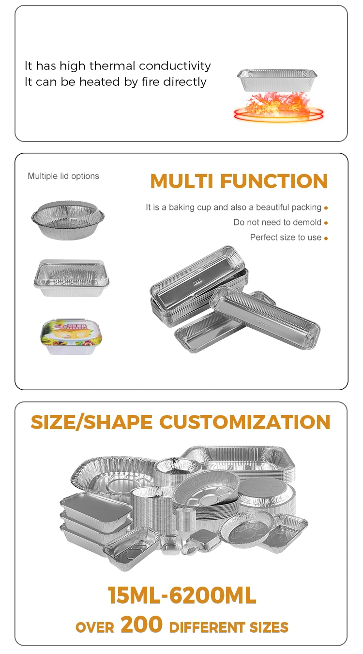 Is féidir úsáid a bhaint as coimeádáin scragall alúmanaim alúmanaim alúmanaim alúmanaim, a úsáidtear go speisialta le haghaidh bácála aráin, mar bhabhla scragall stáin, atá oiriúnach le haghaidh aráin, bácála, tósta, rís bhácáilte agus bianna eile. Tá raon leathan úsáidí ag an gcoimeádán seo, is féidir ábhar teagmhála bia a úsáid in oighinn, gríoscáin barbeque, friothálacha aeir agus trealamh eile san ábhar teagmhála bia-ghrád-ghrád bia, ábhar durable agus nach bhfuil sé éasca a bhriseadh, ábhar teagmhála bia. Tá ábhair ghrád bia éasca le glanadh, is féidir iad a úsáid go díreach i dteagmháil le bia, is féidir iad a chaitheamh i leataobh tar éis úsáid amháin, nach bhfuil sé éasca an bun a bhaint amach, is féidir comhábhair ardcháilíochta a théamh go cothrom, is féidir iad a dhíspreagadh go díreach, ní furasta an bun a bhaint amach. Tacaíocht a thabhairt do chomhcheangal scragall alúmanaim ordú mórdhíola, agus is féidir leis seirbhísí saincheaptha priontála patrún a sholáthar, le MOQ amháin de 1000 píosa. Soláthraíonn an coimeádán scragall alúmanaim airgid barbeque dronuilleogach seo sonraíochtaí agus samhlacha éagsúla le roghnú as, más gá, déan teagmháil leis an bhfoireann díolacháin le haghaidh comhairliúcháin.