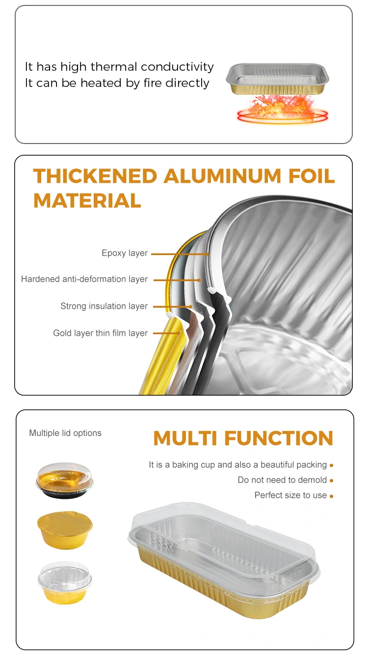 Tóg amach lónadóireachta: oiriúnach chun béilí éadroma ar stíl an Iarthair agus milseoga bácáilte a sheachadadh. Feabhsaíonn an cuma órga an íomhá branda, agus is féidir ról áirithe a bheith ag an ábhar scragall alúmanaim i gcaomhnú teasa freisin.