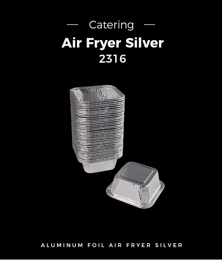 Yunchu aluminum foil supplier Square air fryer Silver Aluminum Foil Containers in catering, home air fryer production, with takeaway delivery, buffet sauces, banquets and other places, but also suitable for steamed eggs, chocolate, biscuits, small cakes, sauces and other ranges, whether it is with food or sauces, can be applied to every catering industry places, can also be used with baked goods, small Is féidir cupáin scragall alúmanaim a chur ar shiúl agus pointí a chur leis na miasa, ach is féidir iad a ní agus a úsáid gan ualach.