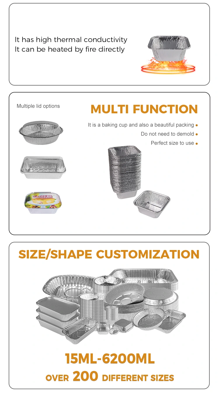Foilsiú alúmanaim Yunchu Cearnóg Aer Fryer Coimeádáin Alúmanaim Aillín Airgid is féidir a úsáid i bhfriochadh aeir, cácaí beaga, luchtú bia beag, seachadadh beir leat, etc., agus is féidir iad a úsáid le haghaidh anlainn, dips, tarsainn bheaga agus samplaí bácála. Chun a chinntiú go bhfuil an coimeádán beag alúmanaim alúmanaim atá luchtaithe sa choimeádán úr, tá sé déanta as 8011 ábhar scragall alúmanaim airgid-ghrád bia, atá múnlaithe go lárnach, agus tá dromchla an bhalla réidh agus glan cosúil le scáthán, atá álainn agus praiticiúil, agus ní ghortaíonn an dearadh imeall do lámha, agus tá an méid oiriúnach agus oiriúnach do radhairc éagsúla.