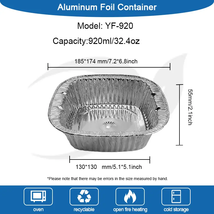 Yunchu a rinneadh sa tSín Samhail YF920 Cearnóg Takeaway Airgid Pacáil Tá coimeádán scragall alúmanaim an -bheag i méid, le trastomhas barr de 185*174 mm (7.2*6.8 orlach), trastomhas bonn de 130*130 mm (5.1*5.1 Inches), Airde de 55 mm (2.1 Inchoes). Ní hamháin go bhfuil an méid seo éasca a iompar, ach is féidir leis freastal ar riachtanais éagsúla úsáide éagsúla.